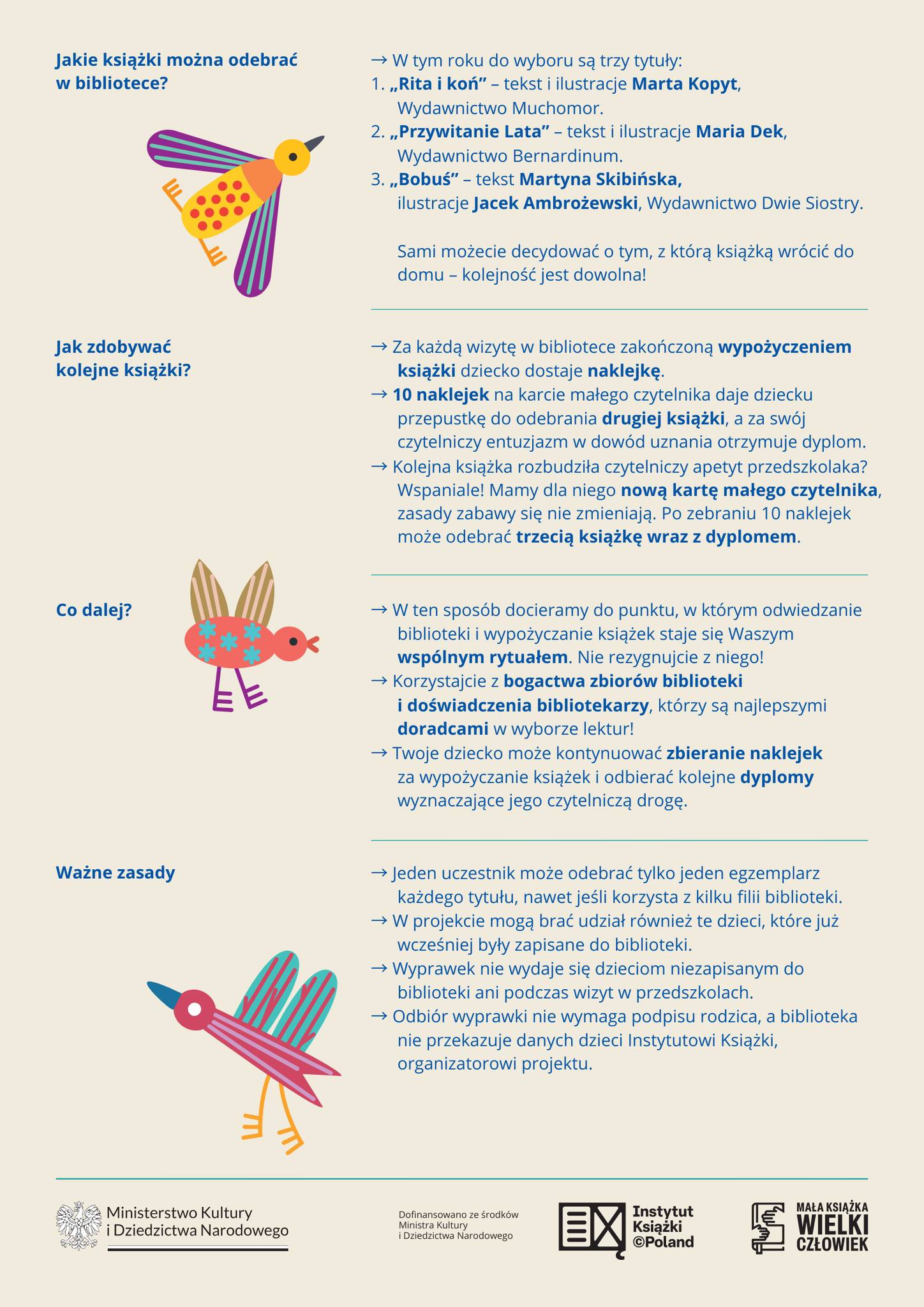 W ramach projektu MAŁA KSIĄŻKA-WIELKI CZŁOWIEK, którego organizatorem jest Instytut Książki, najmłodsi czytelnicy otrzymają wyprawki czyli pierwszą książkę do wyboru spośród wymienionych: „Rita i koń” Marta Kopyt (Wydawnictwo Muchomor), Maria Dek „Przywitanie Lata” (Wydawnictwo Bernardinum) lub „Bobuś” Martyna Skibińska, ilustracje Jacek Ambrożewski (Wydawnictwo Dwie Siostry) oraz kartę małego czytelnika do zbierania naklejek.